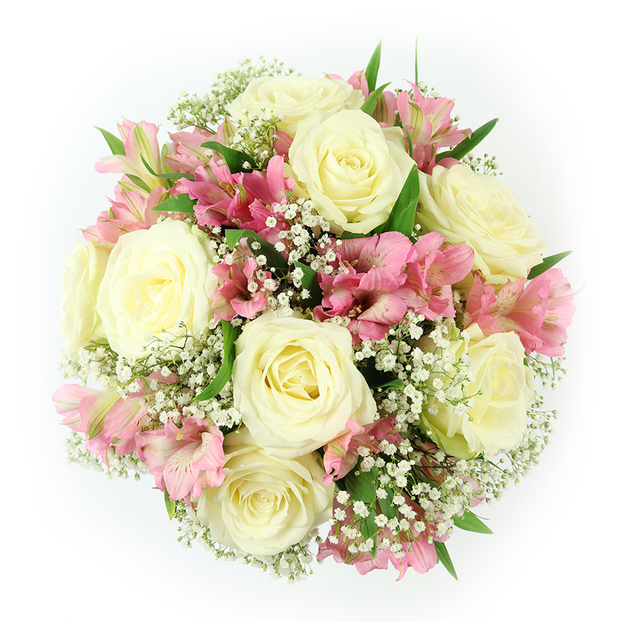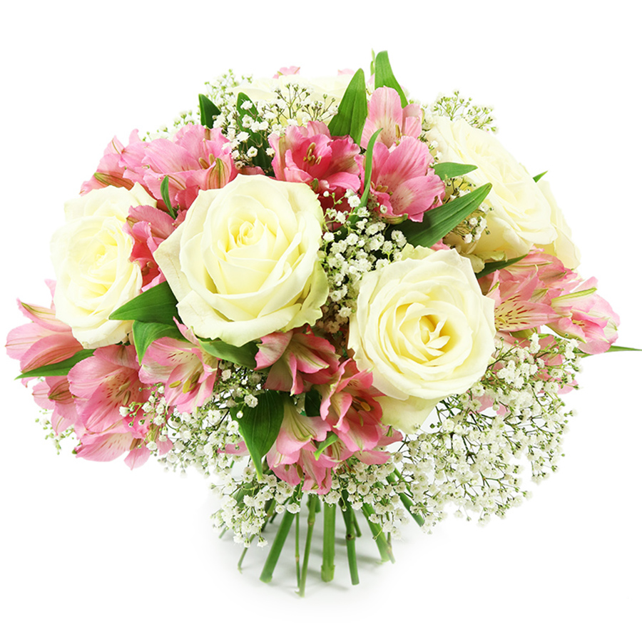 Celebrate any moment with our hand-tied bouquet featuring the delicate beauty of white roses, pink alstroemeria, soft gypsophila, and fresh greenery. This unique arrangement combines elegance and style, perfect for any occasion.